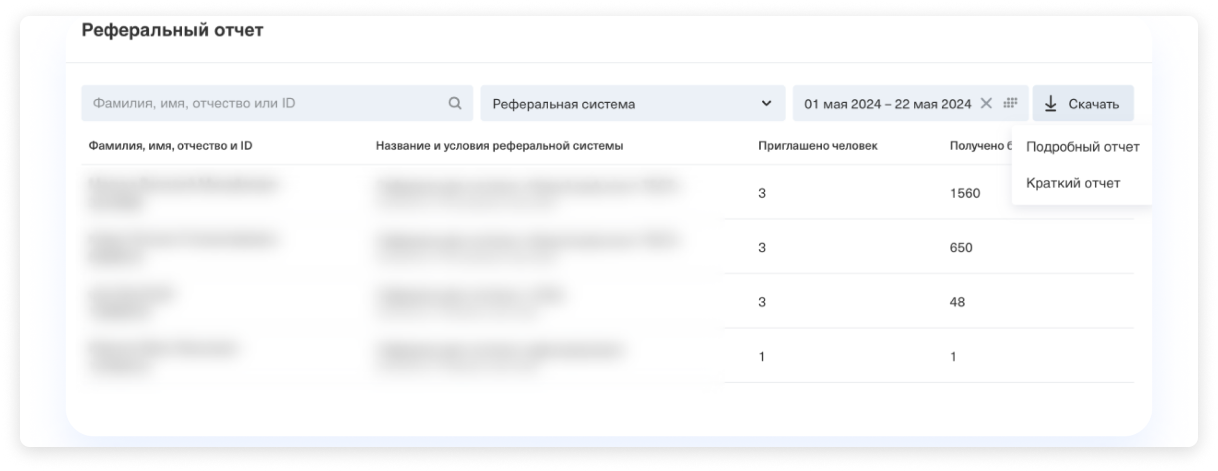 2. Краткий отчет содержит информацию, которая представлена в разделе «Реферальный отчет».