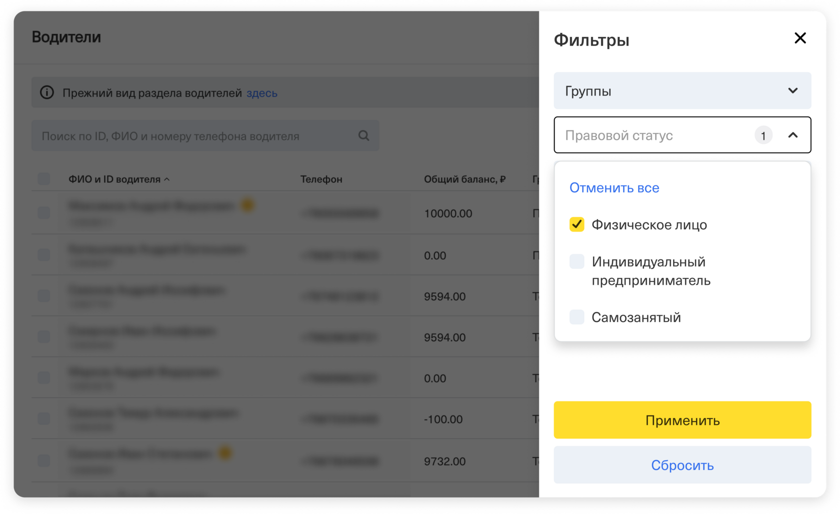 ✓ Добавили отображение правового статуса в раздел «Водители»