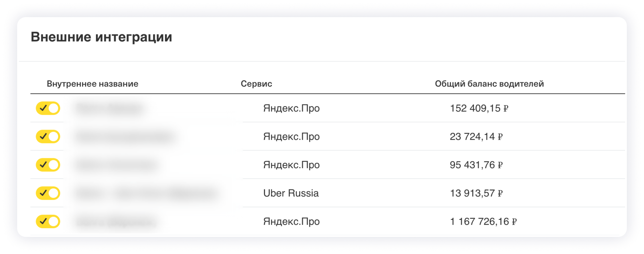 ✓ Обновили подраздел «Внешние интеграции»: общий баланс водителей можно смотреть по каждой интеграции таксопарка