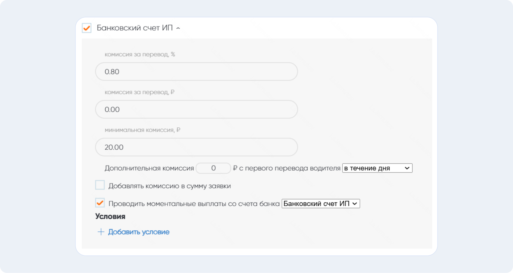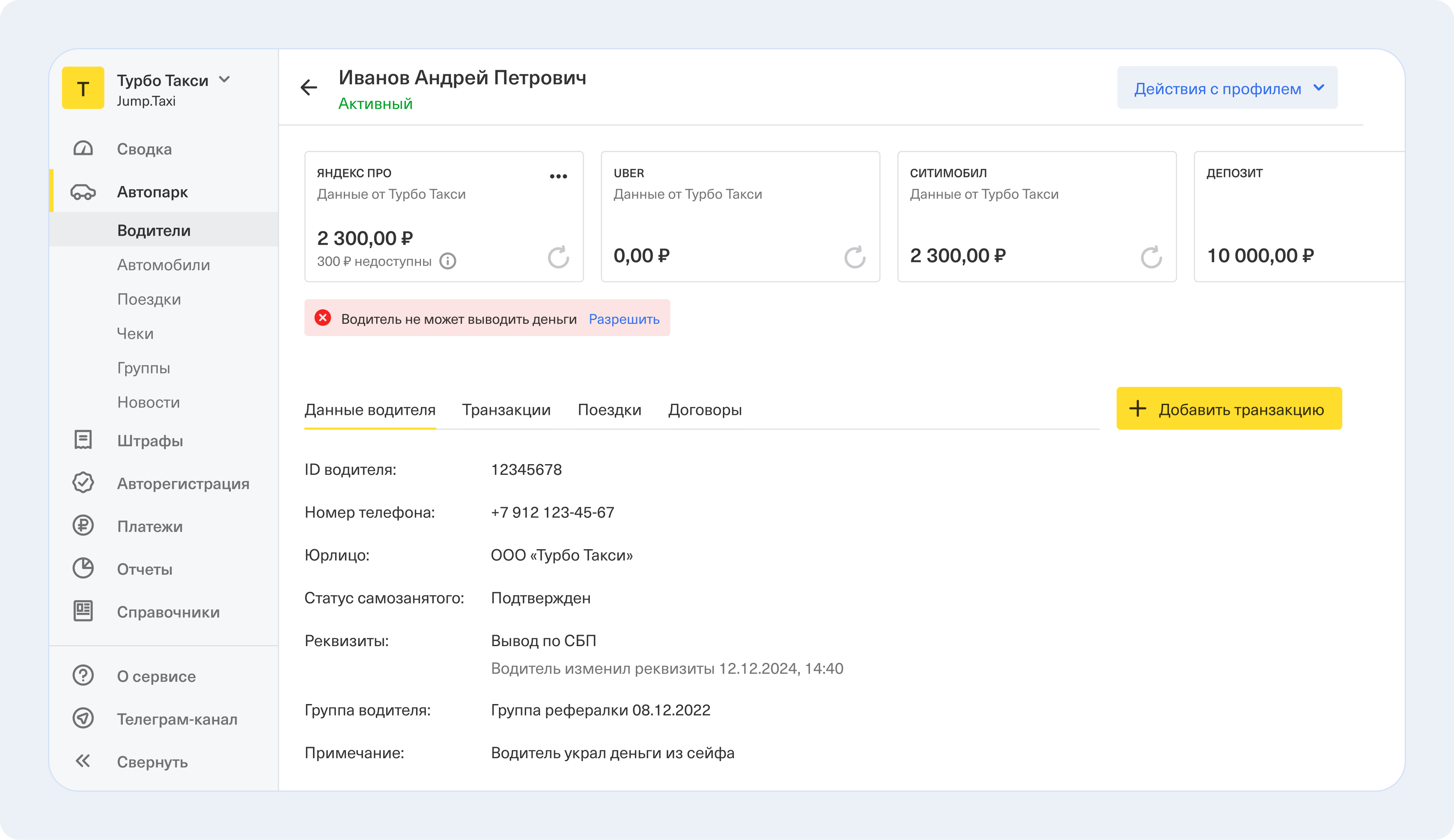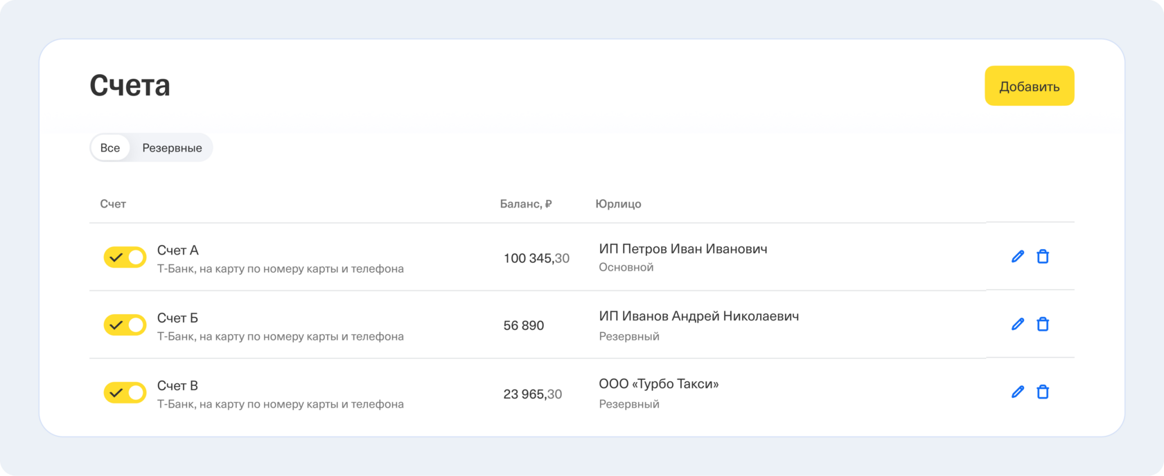 ✓ Автопереключение выплат с основного на резервный счет таксопарка