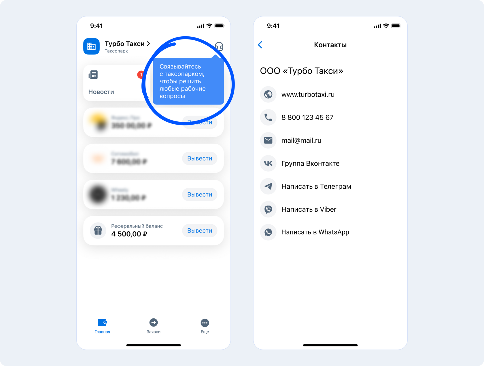 ✓ Номер телефона таксопарка в приложении для водителей и курьеров