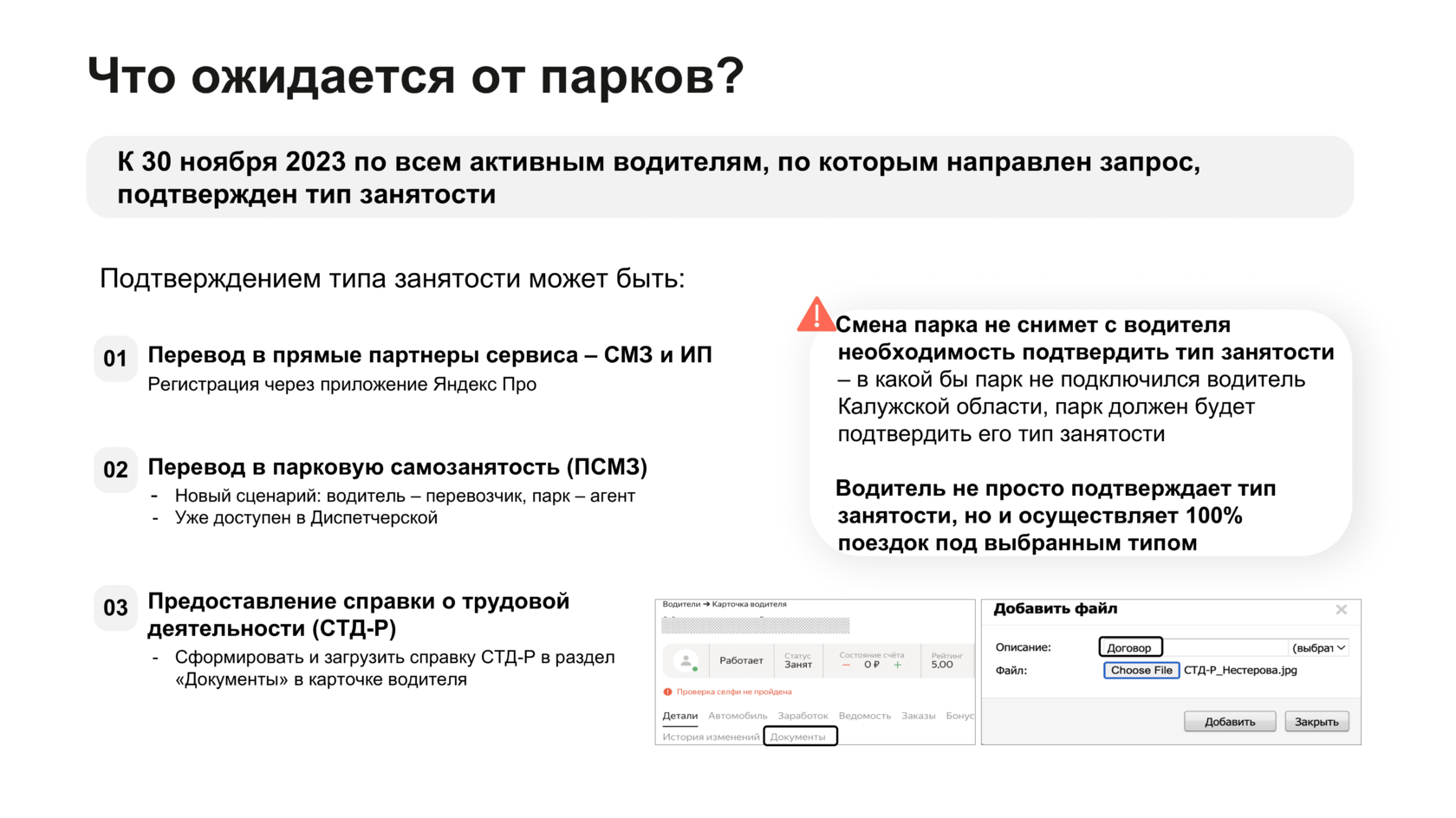 Если водитель в основном работает в других городах, но брал несколько заказов в Калуге, он не будет помечен. Требование к типу занятости возникает в зависимости от доли выкатки в том месте, которое попадает под эксперимент. Что является подтверждением типа занятости водителя