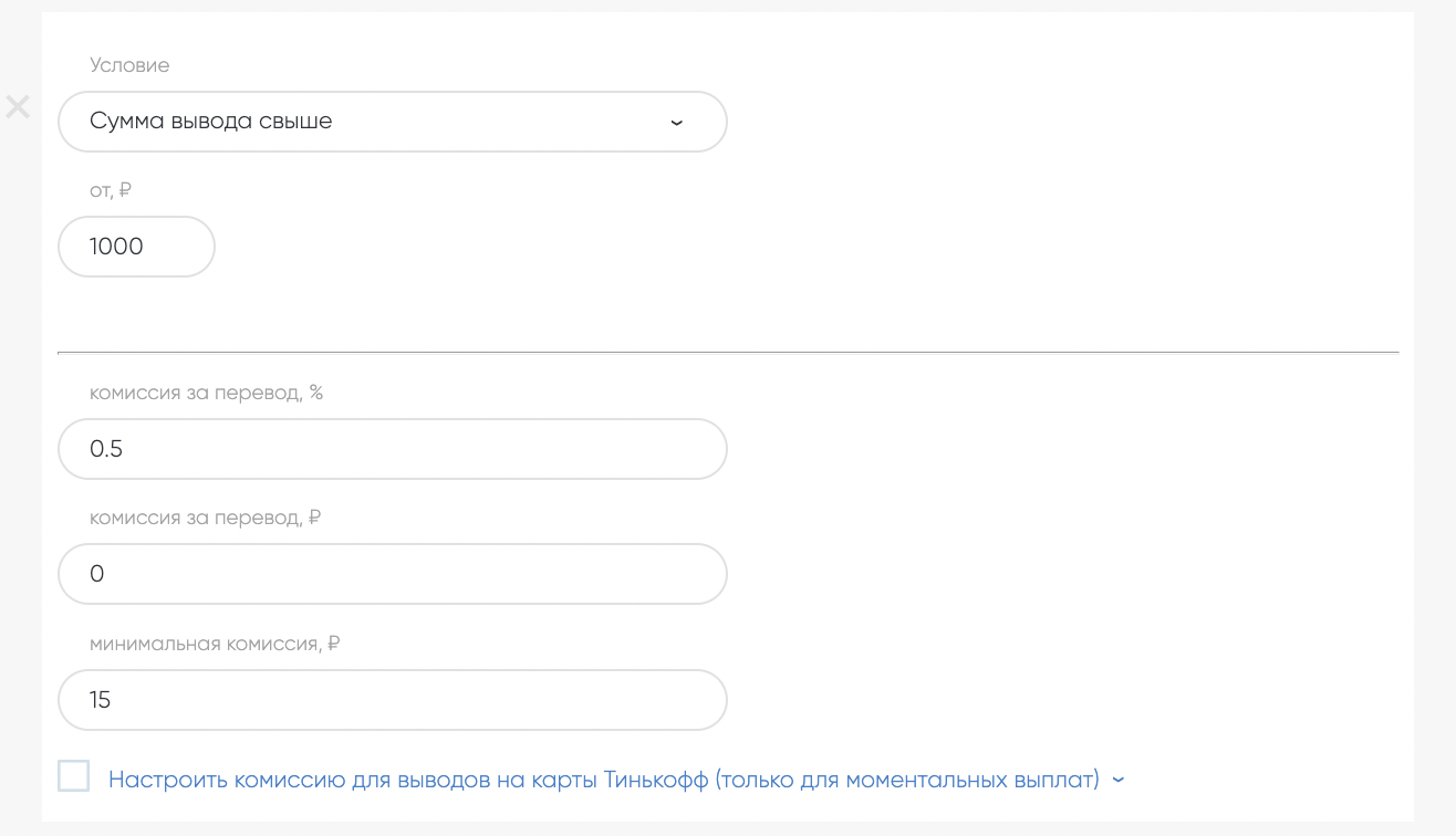 + Добавить условие — позволяет настроить гибкие условия по выводу средств, к примеру, можно указать более выгодную комиссию для выплат более 1000 руб. и менее выгодную для выплат менее 1000 руб.