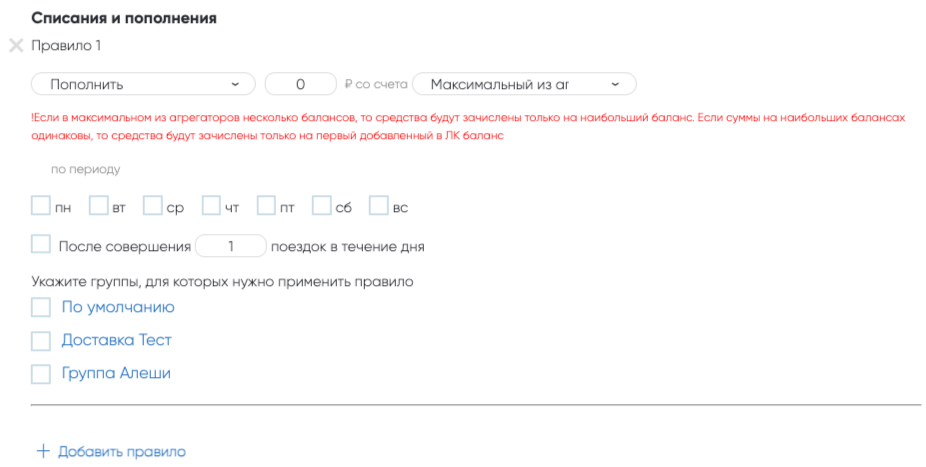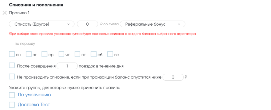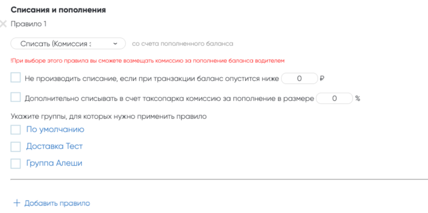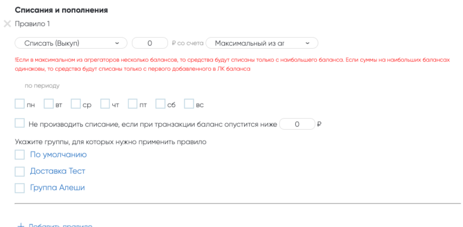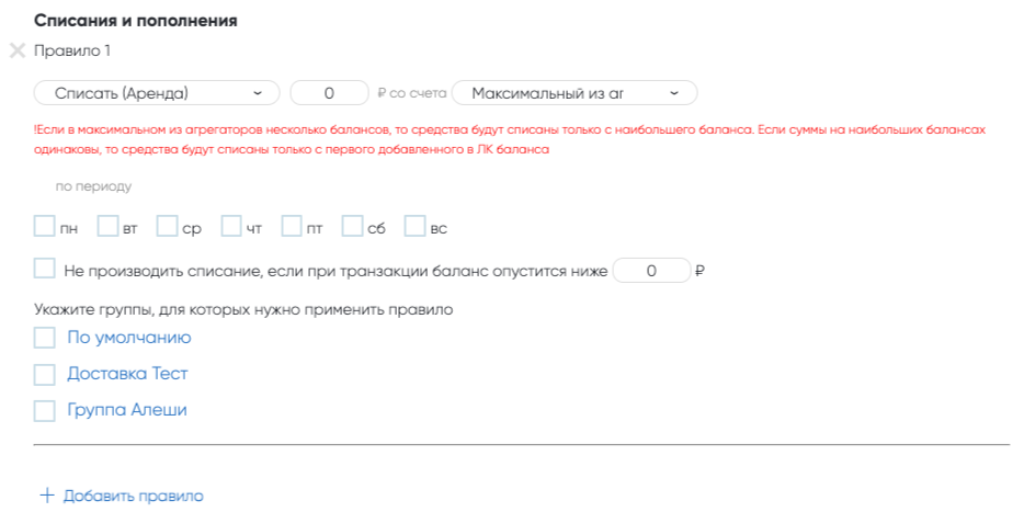 + Добавить правило — позволяет установить несколько правил, если требуется настроить различные типы и сценарии списаний и пополнений