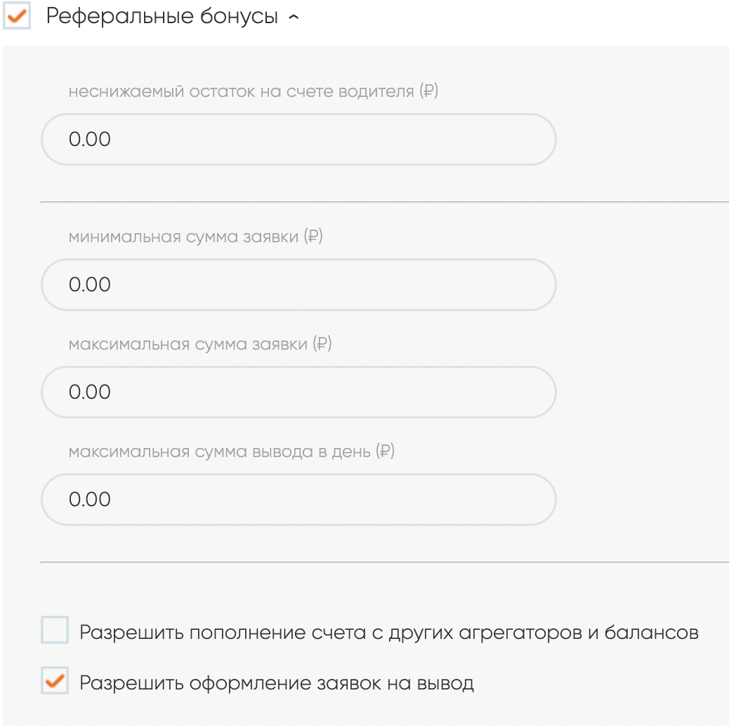 ✓ Разрешить вывод без заполненных реквизитов — позволяет формировать заявки на вывод, не добавляя реквизитов. Как правило, этот параметр не используется (деньги с виртуального баланса водителя спишутся, на счёт не придут).