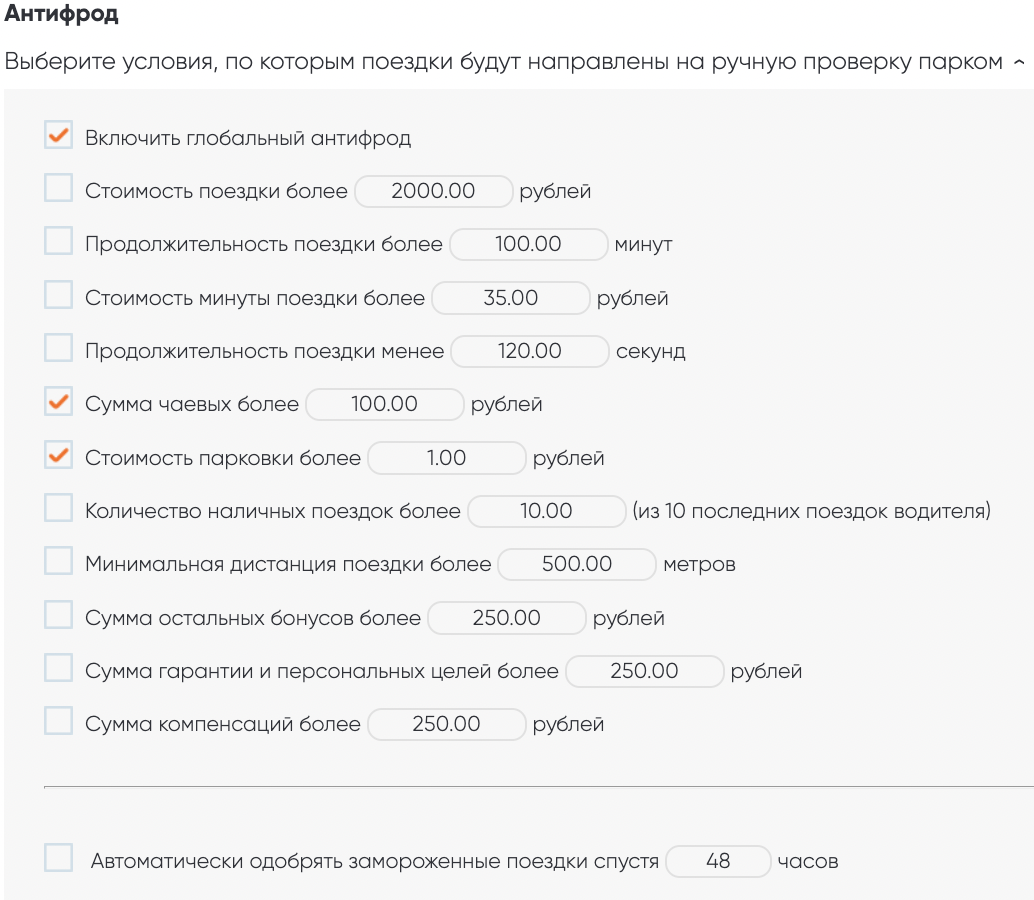 ✓ Включить глобальный антифрод — галочка стоит автоматически. Наша система проверяет поездки на соответствие.