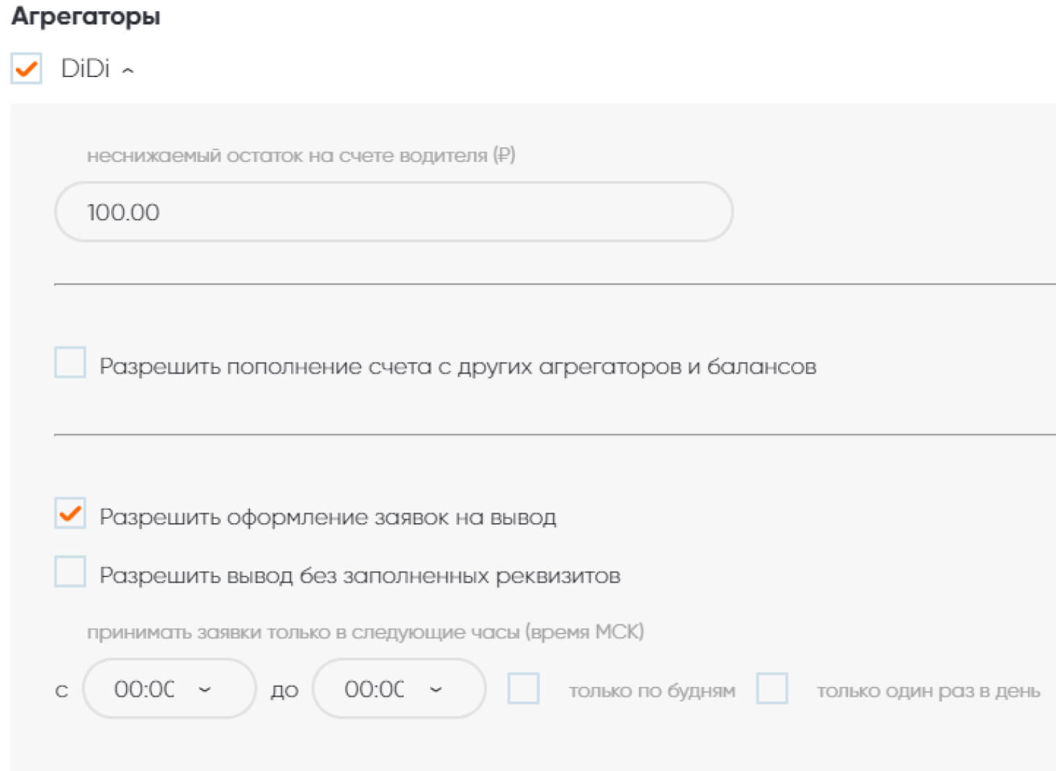 ✓ Минимальная сумма по всем агрегаторам и балансам — запрещает вывод средств с положительного баланса агрегатора, если по сумме всех балансов водителя отрицательное значение. То есть, неснижаемый остаток на балансе водителя будет высчитываться по сумме остатка со всех агрегаторов. А не на каждом из агрегаторов должна будет оставаться указанная в «неснижаемом остатке сумма».