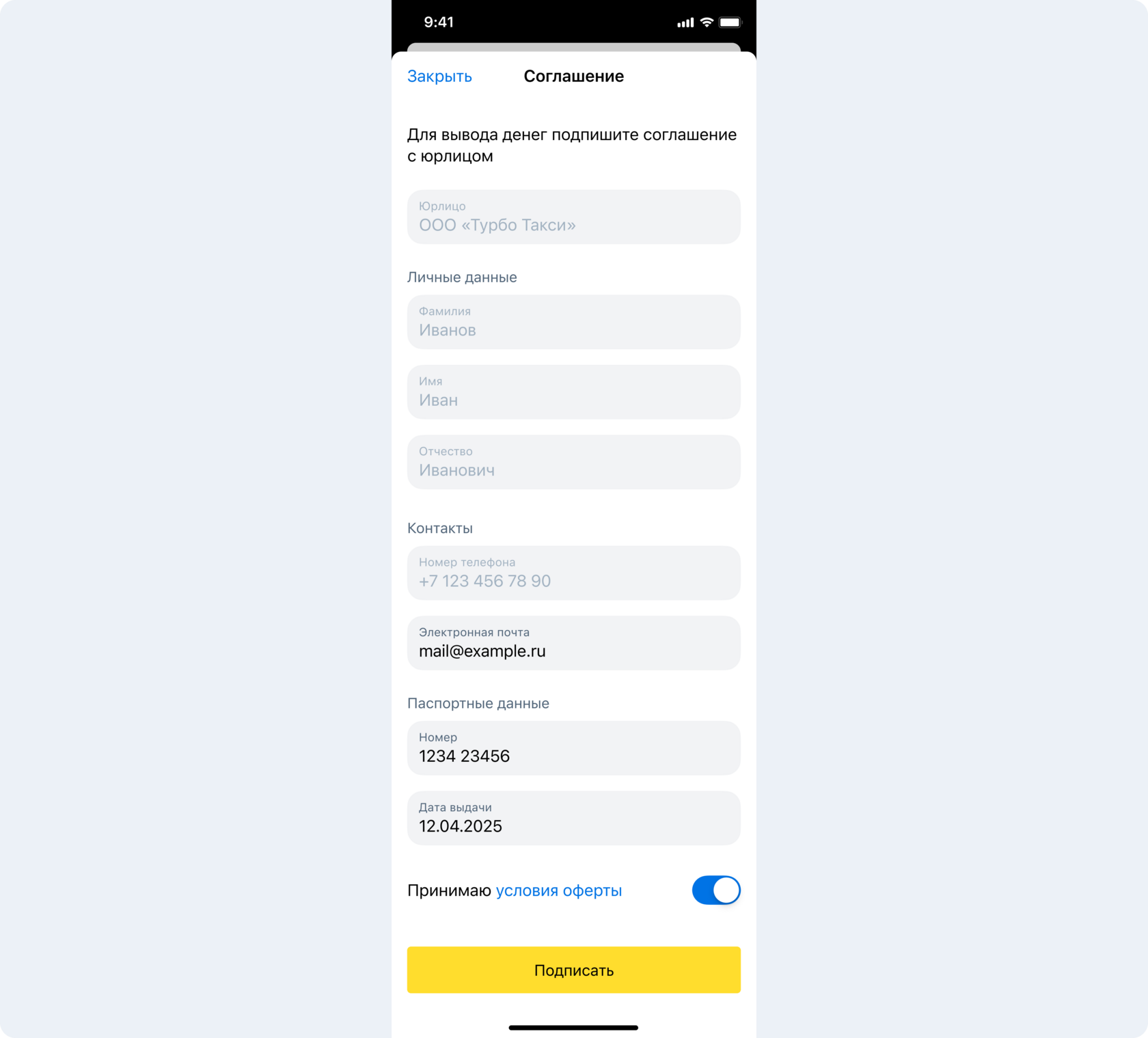 5. Проверьте личные данные в соглашении. Если все корректно, нажмите кнопку Подписать
