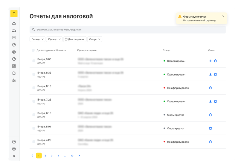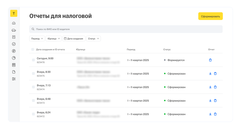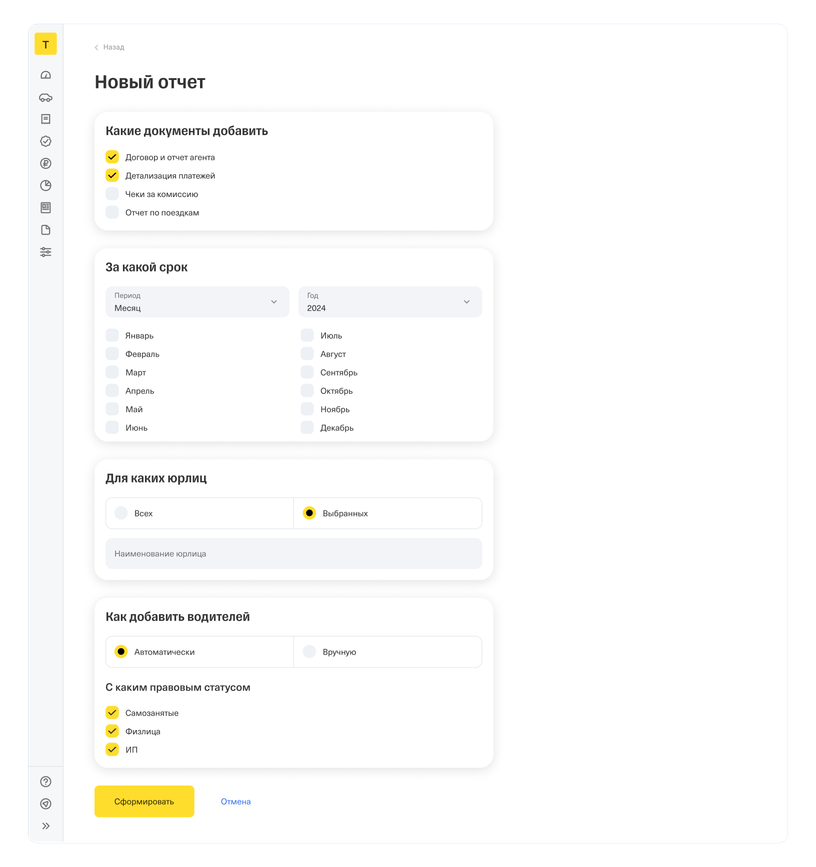 В этом подразделе владелец таксопарка может сформировать отчеты для налоговой: выбрать необходимые документы и скачать их одним файлом. Вот какие документы можно получить: