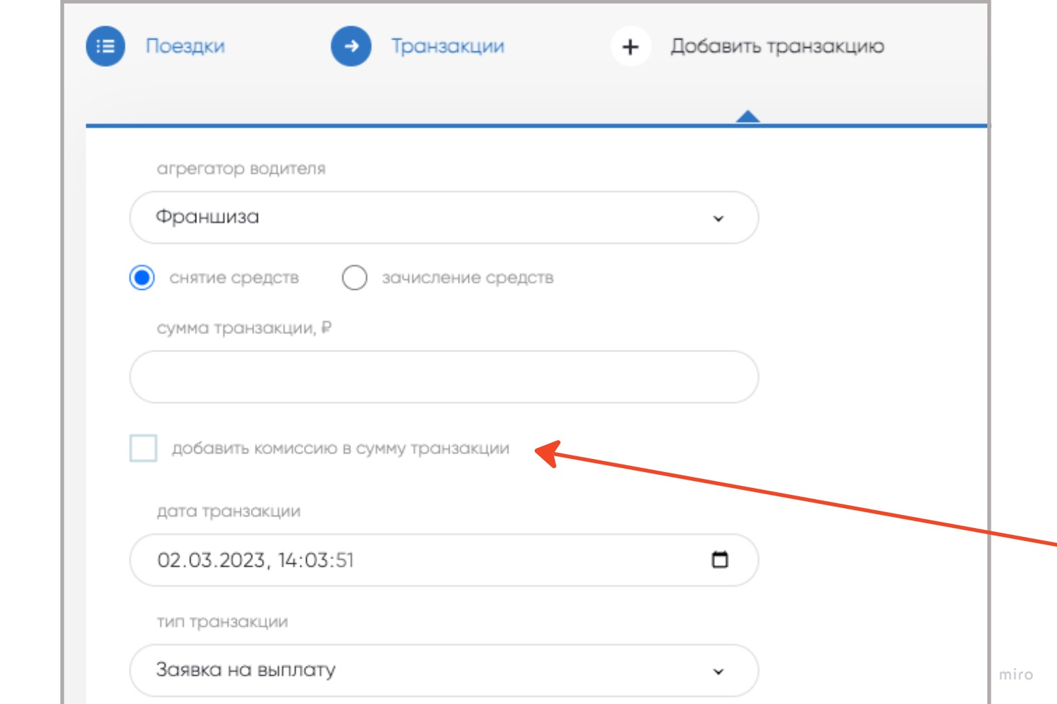 2. Нажать «+Добавить транзакцию»