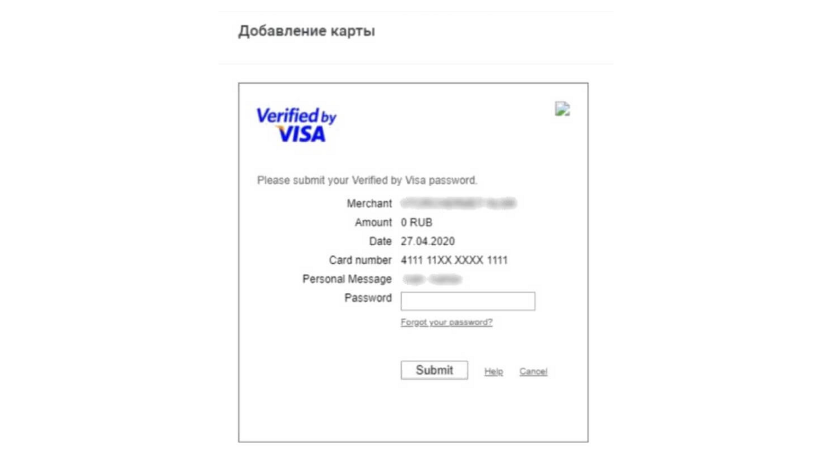 8. После ввода пароля нажмите на кнопку «Submit». После чего добавленная карта отобразится на странице. При подводе курсора к привязанной карте появляются две кнопки: