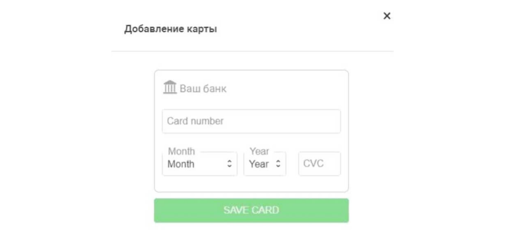 6. Чтобы привязать банковскую карту, кликнете по кнопке «Добавить карту». Откроется следующее окно, в котором нужно заполнить поля.