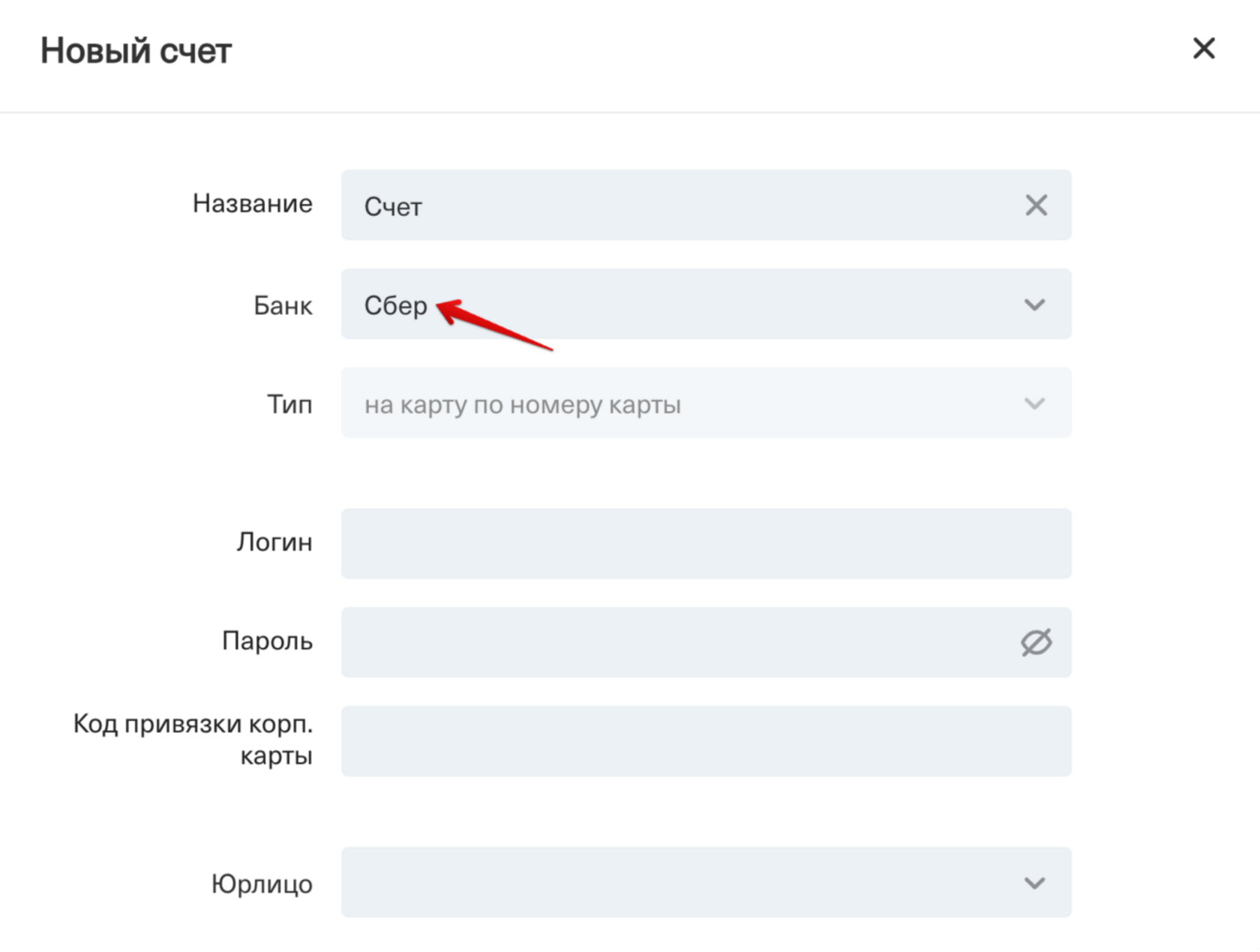 ⭢ Юрлицо — указать юрлицо, к которому привязан расчетный счет.