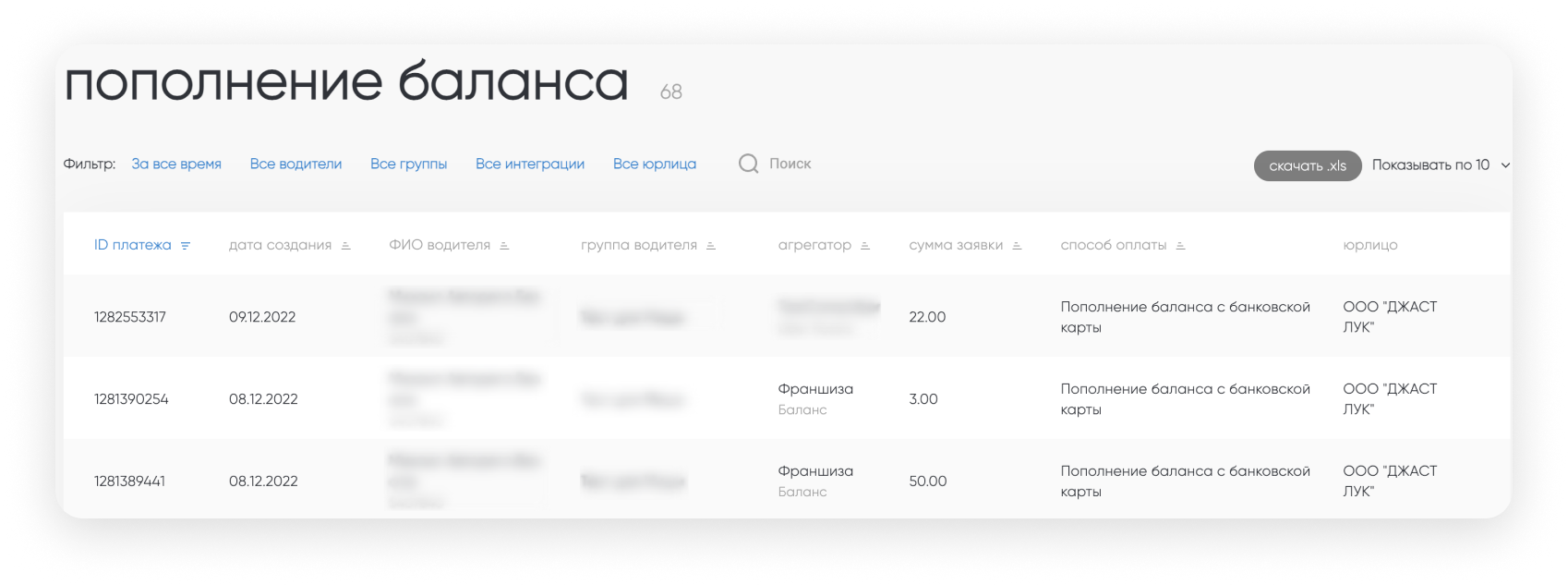 Можно отфильтровать пополнения по юрлицу баланса, который был пополнен с реквизита водителя.
