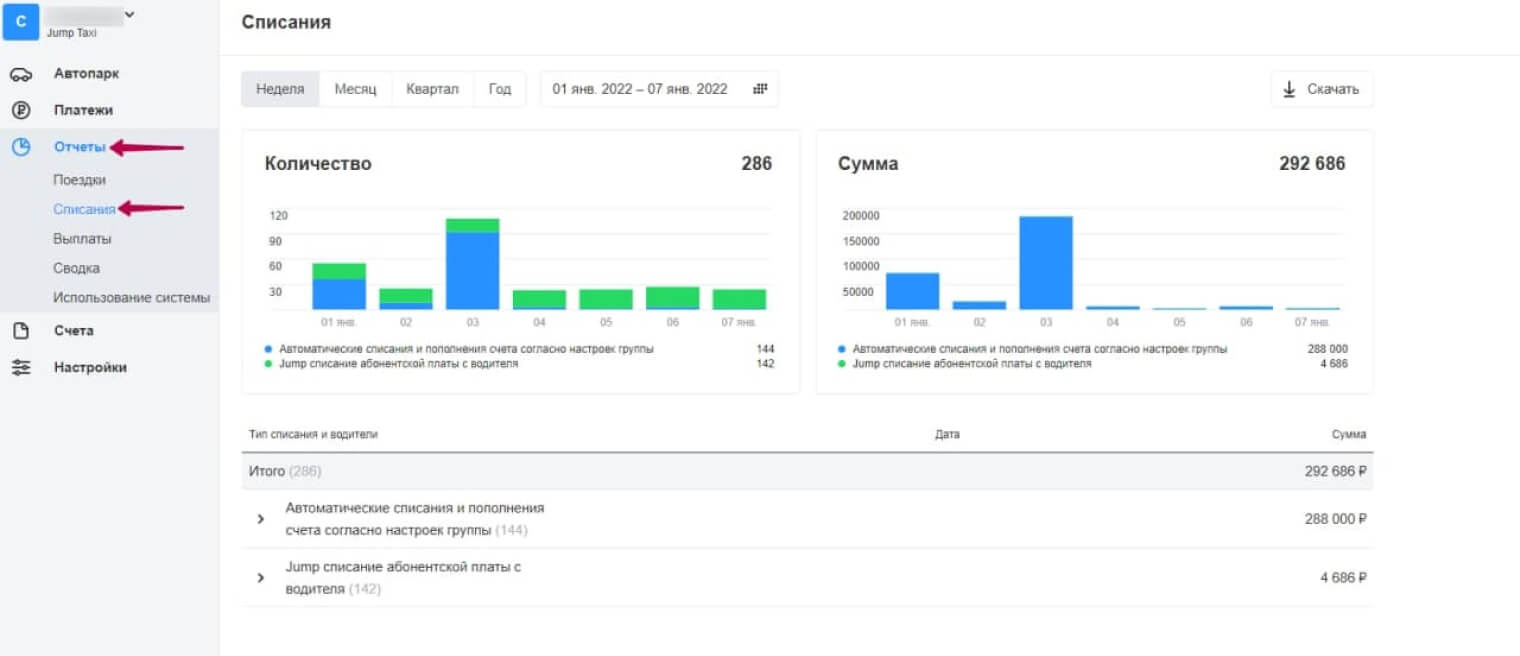⭢ «Jump списание абонентской платы с водителя» — это списание по правилу «Списание и пополнение», которое находится в группе в блоке «Списание и пополнение».