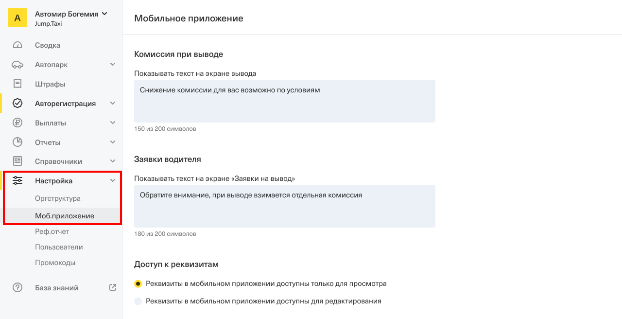 Опция 2. Эта настройка позволяет установить название дополнительного пункта меню, который будет отображаться на вкладке «Еще» в мобильном приложении, а также указать ссылку, по которой должен быть перенаправлен водитель при клике на пункт меню в приложении.